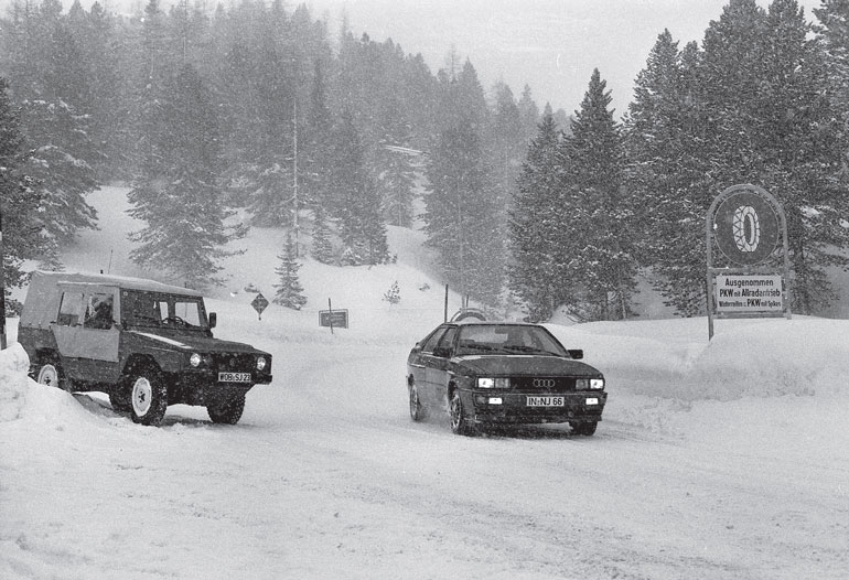 В январе 1978 г. высшее руководство Volkswagen, включая директора по продажам Вернера Шмидта и Эдгара фон Шенка, отвечавшего за маркетинг, а также входивших в состав совета директоров Эрншта Фиалу и Тони Шмюклера, пригласили на тест зимних шин в австрийских Альпах. Деревушка с труднопроизносимым названием Туррахер-хехе считается одним из самых труднодоступных мест в Европе. Узкие дорожки с перепадами высот, подъемы с уклоном до 23 % и захватывающие дух спуски даже в теплое время года представляют сложности для водителей, а зимой и подавно. К тому же январь 1978-го, как по заказу, выдался на редкость снежным: разбушевавшаяся метель сделала дорожку к местному отелю, где традиционно останавливалось руководство Volkswagen, практически непроезжей для обычных легковушек. И это был момент истины для команды Бенсингера.
