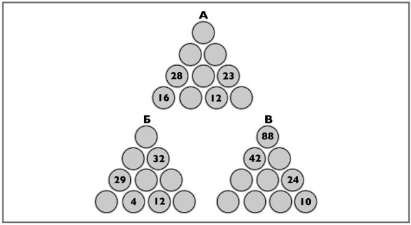 Проделайте это пирамидальное сложение как можно быстрее. Принцип прост: в каждой пирамиде число в кружке является суммой двух чисел в кружках под ним; ваша задача – заполнить пустые кружки, чтобы завершить пирамиды. Сможете заполнить все три пирамиды менее чем за 60 секунд?
