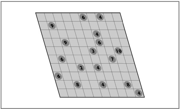Работа над скоростными задачами, подобными этой, напоминает о необходимости точности наблюдений: разумеется, способность запоминать факты, связанные с числами, подрывает небрежность при их запоминании. Ваша задача – определить, какая доля плиток в этом узоре имеет белый цвет и какой процент плиток закрашен темно-фиолетовым цветом.