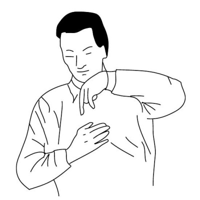 Первый этап . Развернуть левую ладонь внутрь, поместить ее перед грудью. Пальцы смотрят вправо.