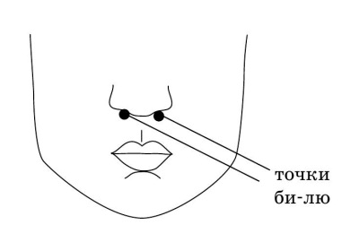 Массировать точки би-лю [50] большим и указательными пальцами правой руки. Массажные движения – надавливания. Количество движений – 64 раза.
