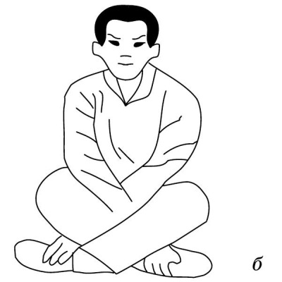 Изначальная позиция. Положение сидя. Ноги скрещены, спина выпрямлена. Тело не напряжено.