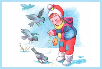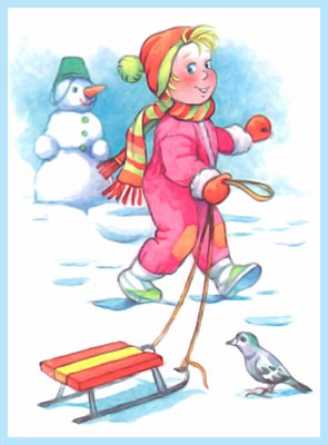 Раз, два, три, четыре, пять, Собираемся гулять. Завязали Катеньке Шарфик полосатенький. Катя саночки везёт От крылечка до ворот. А Серёжа на дорожке Голубям бросает крошки.