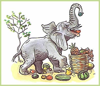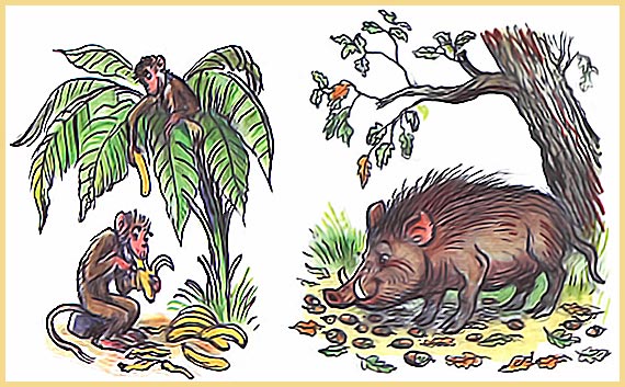 Обезьянка ест банан.Ищет жёлуди Кабан.