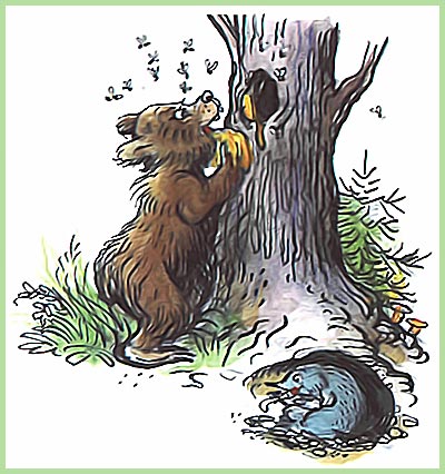 Бурый Мишка лижет мёд.В норке ужинает Крот.