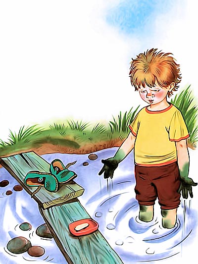 Удивительное дело —Наше мыло похудело,Стало тонкое-тонкое,Словно картонка.А чего мы мылом мыли?Ничего почти не мыли…Руки немножко,Брюки немножкоИ босоножки, но тоже немножко.Было бы ещё похуже,Если б я не мылся в луже.
