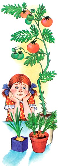 У девочки Веры бабушка есть,У бабушки с Верой работы не счесть.Решили они развести огород…И вот.На рынке купили они семенаИ посадили в горшки у окна,Стояли тёплые деньки,И всё росло вперегонки.Взошли, как чудо-деревца,Зелёные растеньица.Теперь попробуй разберись,Где помидор, а где редис?Что нужно с корнем вырывать,А что любить и поливать?Но как вырос урожайВот такого роста,Лук от репы отличитьСтало очень просто.Вот морковь, вот огурец.Различаешь —Молодец!