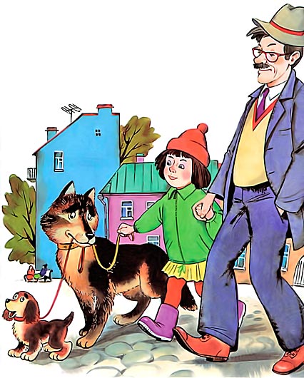 Папа шагает по улице с дочкой,Дочка собаку ведёт на цепочке,Держит собака в зубах поводок,А в поводке выступает щенок.Так и не смог я в тот вечер понять,Кто же кого из них вывел гулять.