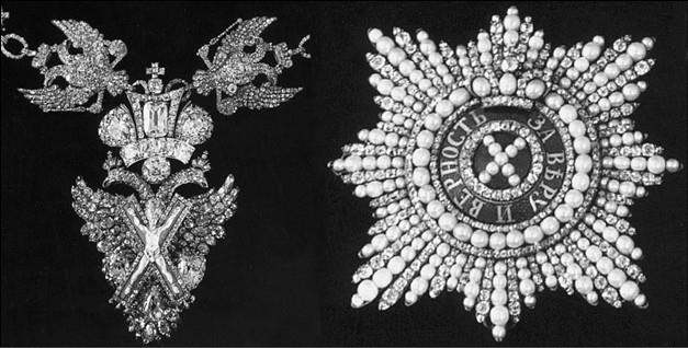 У ордена Св. Андрея Первозванного была одна степень, но существовала еще одна, более почетная разновидность этой награды – знаки ордена с алмазами или бриллиантами. Награждали ею отдельно. Так, А.В. Суворов был удостоен самого ордена в 1787 г. за победу при Рымнике, а два года спустя за победу при Кинбурне получил алмазные орденские знаки.