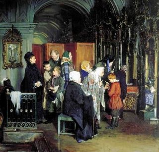 Ваня Шмелев помнил свою первую исповедь всю свою жизнь: «Приходим загодя до вечерни, а уж говельщиков много понабралось. У левого крылоса стоят ширмочки, и туда ходят по одному, со свечкой. Вспомнил я про заслончик — душа сразу и упала. Зачем заслончик? Горкин мне объяснил: это чтобы исповедники не смущались; тайная исповедь, на духу, кто, может, и поплачет от сокрушения, глядеть посторонним не годится. Стоят друг за дружкой со свечками, дожидаются череду. И у всех головы нагнуты, для сокрушения. Я попробовал сокрушаться, а ничего не помню, какие мои грехи. Горкин сует мне свечку, требует три копейки, а я плачу.