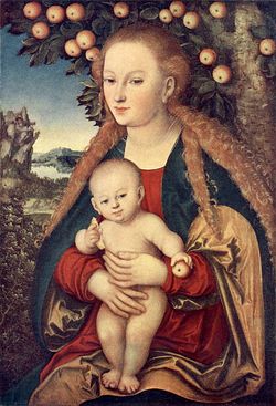 Это не икона, а картина немецкого художника и графика эпохи Возрождения Лукаса Кранаха Старшего (1472–1553). Называется она «Мадонна с Младенцем под яблоней» (1526), хранится в Государственном Эрмитаже. В западной культуре сложилась традиция представлять в качестве плода древа познания добра и зла яблоко. Произошло это, возможно, из-за сближения двух латинских существительных: malum (яблоко) и malus (зло). В картине Лукаса Кранаха Старшего Божия Матерь изображается как вторая Ева, Которая содействовала искуплению рода человеческого от греха прародителей. В правой ручке Богомладенец держит хлеб, что указывает на великое таинство тела Христова.