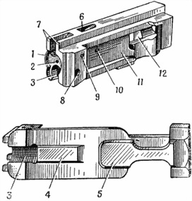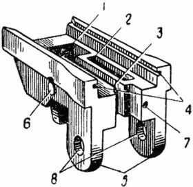1 — гнездо для шептала с пружиной; 2 — гнездо для упора предохранителя и его пружины; 3 — гнездо для рычага шептала; 4 — продольные пазы; 5 — проушины; 6 — отверстие для предохранителя; 7 — отверстие для заднего конца упора предохранителя; 8 — отверстия проушины для болта заднего крепления