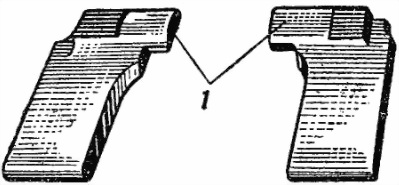 Боевые упоры (рис. 33) совместно с остовом затвора предназначены для запирания канала ствола при выстреле. Они помещаются в боковых выемах остова затвора. В задней части боевые упоры имеют выступы, на нижнюю часть которых нажимают стенки фигурного выема рамы и сводят упоры, а на внутреннюю часть нажимает своей утолщенной частью и разводит упоры ударник.