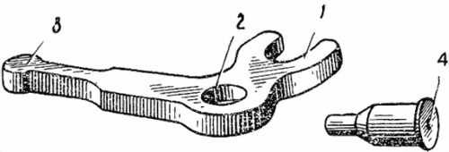 1 — головка с вилкой; 2 — отверстие для оси; 3 — хвост; 4 — ось