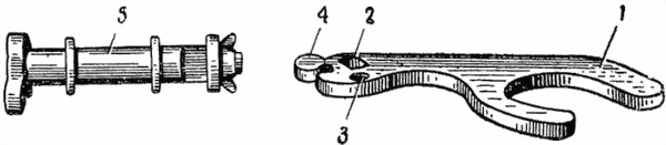 1 — изгиб; 2 — проушина; 3 — ось; 4 — верхние пальцы; 5 — пружина