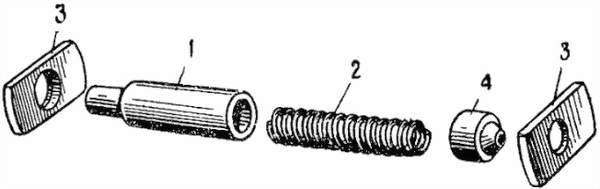 1 — стопор; 2 — пружина; 3 — пластинки; 4 — упор