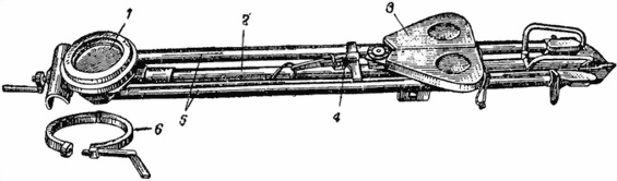 1 — правая часть хомута; 2 — левая часть хомута; 3 — стяжной болт хомута с рукояткой горизонтального зажима