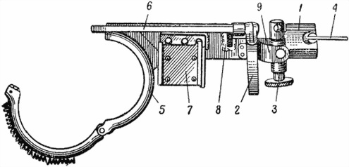 1 — остов основания; 2 — зажим грубой вертикальной наводки; 3 — механизм тонкой наводки; 4 — зажим тонкой вертикальной наводки; 5 — хомут; 6 — тяга основания; 7 — кронштейн патронной коробки; 8 — выступ с окном; 9 — кронштейн механизма тонкой вертикальной наводки