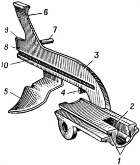 1 — пазы; 2 — цилиндрическое гнездо; 3 — кронштейн; 4 — пружинная задержка; 5 — гильзоотвод; 6 — большой вертикальный выступ; 7 — ось для соединения с механизмом тонкой наводки; 8 — отверстие для ограничительного винта ползуна; 9 — направляющий выступ для движения ползуна; 10 — продольный направляющий паз