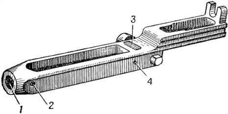 — внутри два продольных канала: верхний (наклонный) для помещения отражателя, стержня отражателя и его пружины, нижний (осевой) для помещения ударника, бойка и пружины бойка;