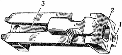 1 — канал для отражателя с пружиной; 2 — канал для ударника; 3 — продольный паз для выбрасывателя с пружиной