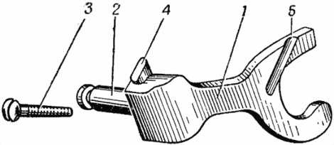 1 — плечо с вилкой; 2 — цилиндрическое плечо; 3 — винт; 4 — зуб рычага; 5 — выем