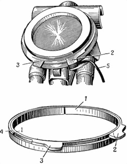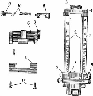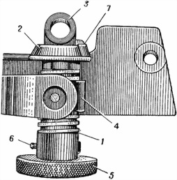 1 — наружный подъемный винт; 2 — прицельное кольцо; 3 — головка с внутренним подъемным винтом; 4 — матка подъемного винта; 5 — маховичок; 6 — шплинт; 7 — указатель