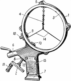 1 — передний визир; 2 — задний визир; 3 — хомут; 4 — курсовой визир; 5 — промежуточный кронштейн; 6 — валик; 7 — ключи