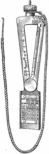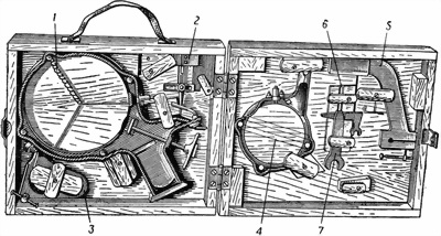 Кольцевой передний визир свободно вращается на цапфах. При нажатии рукой на плечики груза-отвеса и при упоре большим пальцем в гайку груз-отвес свободно снимается с квадрата правой цапфы. При повороте его относительно плоскости колец на 90° он снова заскакивает на квадрат.