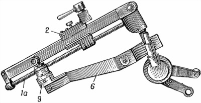 а) Дистанционная линейка с центральной осью и отверстием для опорного винта имеет качание в вертикальной плоскости вокруг центр аль ой оси. Отверстие, через которое проходит опорный винт коромысла, служит для перестановки линейки из рабочего положения в выверочное и обратно.