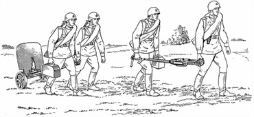 Примечания: 1. При переводе пулемета в положение для зенитной стрельбы по команде «По самолету» во время ведения огня из положения для стрельбы по наземным целям или по команде «К бою», когда пулемет уже подготовлен для ведения огня из положения для наземной стрельбы, работа выполняется так же, как указано в ст. 259–261, Дополнительно в начале работы первый номер устанавливает тело пулемета вдоль ног, переводит предохранитель на «Стоп», сводит седло-подлокотники и опускает прицельную рамку; второй номер закрепляет зажим грубой и тонкой вертикальной наводки; третий номер закрепляет зажим горизонтальной наводки.