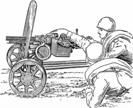 262. Второй номер снимает чехол с дульной части. Поднимает левую завертку щита. Берется за левое колесо хода. Левой рукой поддерживает пулемет за ход, правой рукой отводит левую переднюю ногу вперед и в сторону до отказа. Опускает пулемет на передние ноги. Надевает на пулемет магазин-коробку; устанавливает зенитный прицел; открепляет зажим грубой вертикальной наводки.