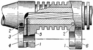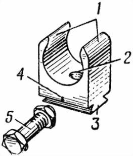 1 — щеки; 2 — нарезное гнездо; 3 — выступ; 4 — риска; 5 — болт с гайкой