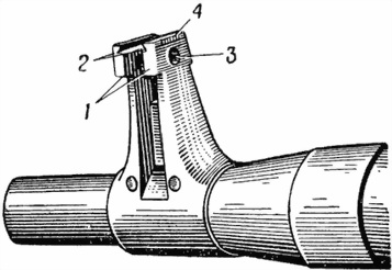 Предохранитель мушки (рис. 13) защищает мушку от ударов. Он имеет две щеки, нарезное гнездо для соединения с мушкой, выступ для соединения с основанием мушки и болт с гайкой. На стенках предохранителя нанесены установочные риски.