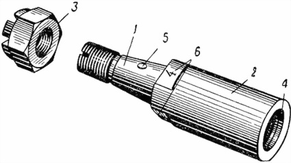 1 — конический хвост; 2 — цилиндрическая часть; 3 — гайка; 4 — глухой продольный канал; 5 — газовое отверстие; 6 — цифры