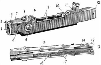 1 — сквозной канал для ствола; 2 — продольный паз для прохода выступа ствола; 3 — сквозное поперечное окно; 4 — поперечный паз для крепления зенитного прицела; 5 — задержки приемника; 6 — проушина; 7 — паз для шайбы клина; 8 — цапфы; 9 — выем для приемника; 10 — направляющий штифт для приемника; 11 — основание прицела; 12 — отверстие для чеки; 13 — вертикальные пазы для соединения с затыльником; 14 — продольные пазы для выступов спусковой коробки; 15 — продольные пазы для направления движения затворной рамы; 16 — боевые уступы; 17 — желобки