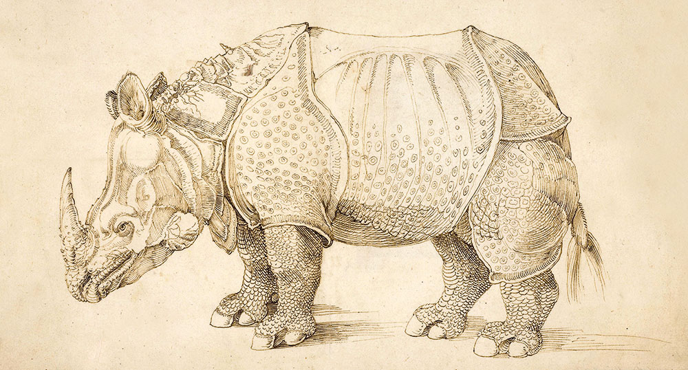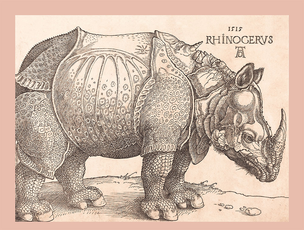 Он властно занимает все пространство изображения до самых краев. На первый взгляд, картина не рассказывает нам никакой истории, у нее нет сюжета. Есть только животное, причудливое, редкое и экзотическое, которое на момент написания картины почти никто в Европе не видел вживую. Это носорог, нарисованный, а затем выгравированный Альбрехтом Дюрером в Нюрнберге, вероятно, летом 1515 года.