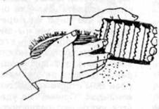 Прежде всего надо убедиться в чистоте коня. Нельзя седлать невычищенную лошадь. Чистка производится с помощью щетки и скребницы. Щетка берется в правую руку (для правшей), скребницу — в левую (Рис.4). Щеткой несильно проводят против шерсти, затем с усилием — по шерсти (в том же месте). Следующим движением проводят щеткой по зубьям скребницы (очистка щетки). Скребницу после 10—15 очисток выбивают. Металлической скребницей лошадь трогать нельзя. Сильно загрязненные участки замывают водой, оттирают соломенными жгутами. Можно пользоваться резиновыми и пластмассовыми скребницами, Чистка производится с более чистых «частей — шеи. спины — к более загрязненным — животу, ногам (Рис.б). Особое внимание уделяют участкам, соприкасающимся с седлом — холке, спине, животу в том месте, где накладывают подпруги. Гриву и хвост расчесывают специальными металлическими расческами. Копыта очищают крючком. Особенно важно это делать после езды по мелким камням, гравию.