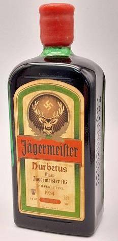 «Егермейстер» времен нацистской Германии. Возможно подделка. Присутствие свастики на бутылках Егермейстера в 1934–1945 гг. остается дискуссионным вопросом среди историков и любителей алкоголя.
