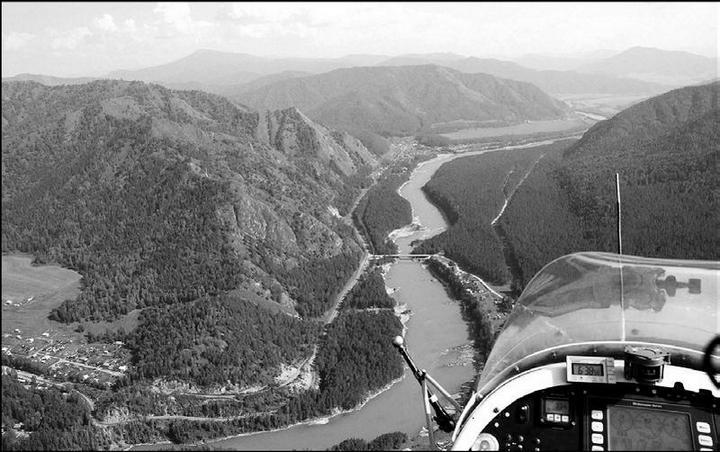 И толкнуло меня на сей подвиг только одно – интересы дела! Можно было, конечно, дня два мотаться по серпантинам горных дорог (что тоже небезопасно), но поджимало время. Жаль, никто не запечатлел мой подвиг для потомства! Посему – довольствуйтесь снимком, сделанным мной с отсутствующего борта сего летательного аппарата. Это Катунь под нами. А ощущения и впечатления, поверьте, необычные и незабываемые. И ничуть не страшно. Когда делом занят.