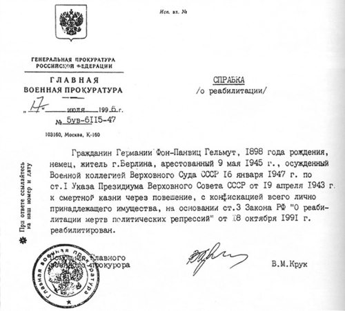 Но для ельцинской прокуратуры всего этого оказалось недостаточно. Формальным поводом к пересмотру дела эсэсовского атамана стала просьба о реабилитации своего деда, с которой обратилась внучка фон Панвица Ванесса фон Бассевиц. 22 апреля 1996 года помощник главного военного прокурора полковник юстиции Виктор Крук представил на утверждение заместителю главного военного прокурора генерал-лейтенанту юстиции Владимиру Смирнову соответствующее заключение. Итогом работы ельцинской юстиции стала справка о реабилитации из Главной военной прокуратуры от 17 июля 1996 года за № 5-ув-6115-47.