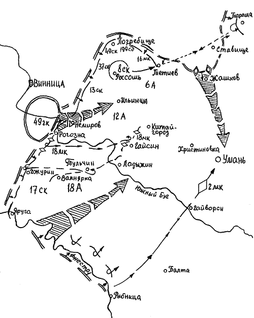 Проведение глубокого охвата на Кировоград начать еще не удалось… В районе западнее Умани, видимо, еще остаются крупные силы противника. Вопрос о том, удастся ли их окружить, зависит от того, сколько времени потребуется на преодоление сопротивления 26-й русской армии».