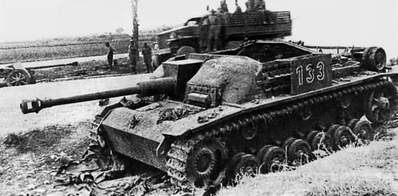 Подбитая САУ «Штурмгешюц» на подступах к Берлину. Крыша самоходки сорвана взрывом боекомплекта