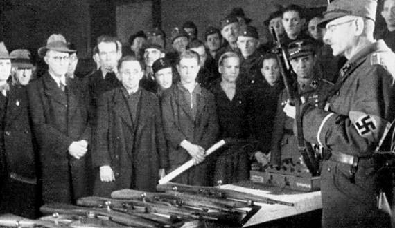 Обучение фольксштурмистов. Этим людям в очках и шляпах завтра предстояло выдержать удары советских танков. Преподаватель в повязке со свастикой символизирует «партийное начало» в создании фольксштурма