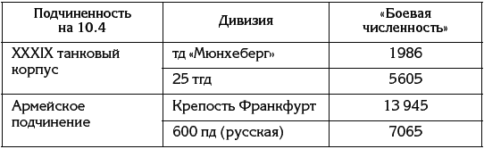 Несмотря на то, что большинство соединений на берлинском направлении были недавно сформированы, их «боевая численность» была доведена до высоких значений (см. таблицу). Даже недавно прошедшая разгром в Восточной Померании 5-я егерская дивизия была доведена до «боевой численности», которой могли бы позавидовать многие пехотные дивизии вермахта в середине войны. Обращаю внимание на высокую «боевую численность» эсэсовской пехотной дивизии и 9-й воздушно-десантной дивизии. Эти не относившиеся к вермахту формирования имели свои штаты и, несмотря на схожесть с организационной структурой армейских формирований, превышали «боевую численность» ПД-44 в 6410 человек. Власовская 600-я пехотная дивизия также превышала по своей «боевой численности» штат соединений вермахта. Хотя ее присутствие в данной таблице скорее формальность. После наступления локального значения 13 апреля 1945 г. начальник штаба 9-й армии полковник Хольц рапортовал ОКХ «В связи с некомпетентностью дивизии во время сегодняшней атаки и поступившими сведениями о недисциплинированности дивизии, предлагается разоружить ее и перевести в другой район». В итоге дивизия РОА была передана в подчинение группы армий «Центр». Несмотря на попытки Шернера отправить власовцев на фронт, командир дивизии Буняченко увел своих людей в Богемию, и в сражении за Берлин соединение не участвовало.