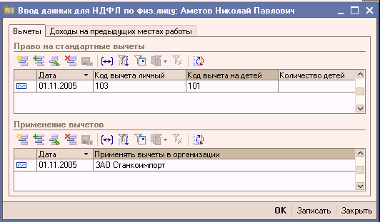Закладка «Доходы на предыдущих местах работы» формы предназначена для ввода данных о доходах физического лица на предыдущем месте работы. Эти данные используются для определения права физического лица на стандартные вычеты.