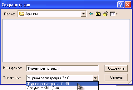 Для сохранения записей журнала регистрации в файл откройте журнал регистрации и выберите пункт «Файл» – «Сохранить копию». На экран выводится диалог выбора каталога и файла, в который будет произведена выгрузка, а также тип файла (по умолчанию указывается тип журнала регистрации «*.elf»). Выгрузка также возможна в формате XML.