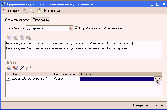 После определения источников данных и отбора, нажатием на кнопку «Отобрать» на странице «Обработка» формируется таблица элементов, удовлетворяющих условиям отбора. Напротив каждого элемента можно установить/снять пометку, обрабатываться будут только отмеченные.