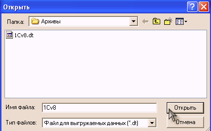 При загрузке информационной базы (меню «Администрирование» – «Загрузить информационную базу») система открывает стандартный диалог выбора файла: