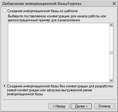 информационная база без конфигурации. К ней можно будет впоследствии подключить требуемую конфигурацию из соответствующего файла (порядок подключения конфигурации "Бухгалтерский учет" мы рассмотрим позже).Нажатием кнопки Далее осуществляется переход к следующему этапу создания информационной базы. При этом на экране отобразится окно, которое показано на рис. 1.4.